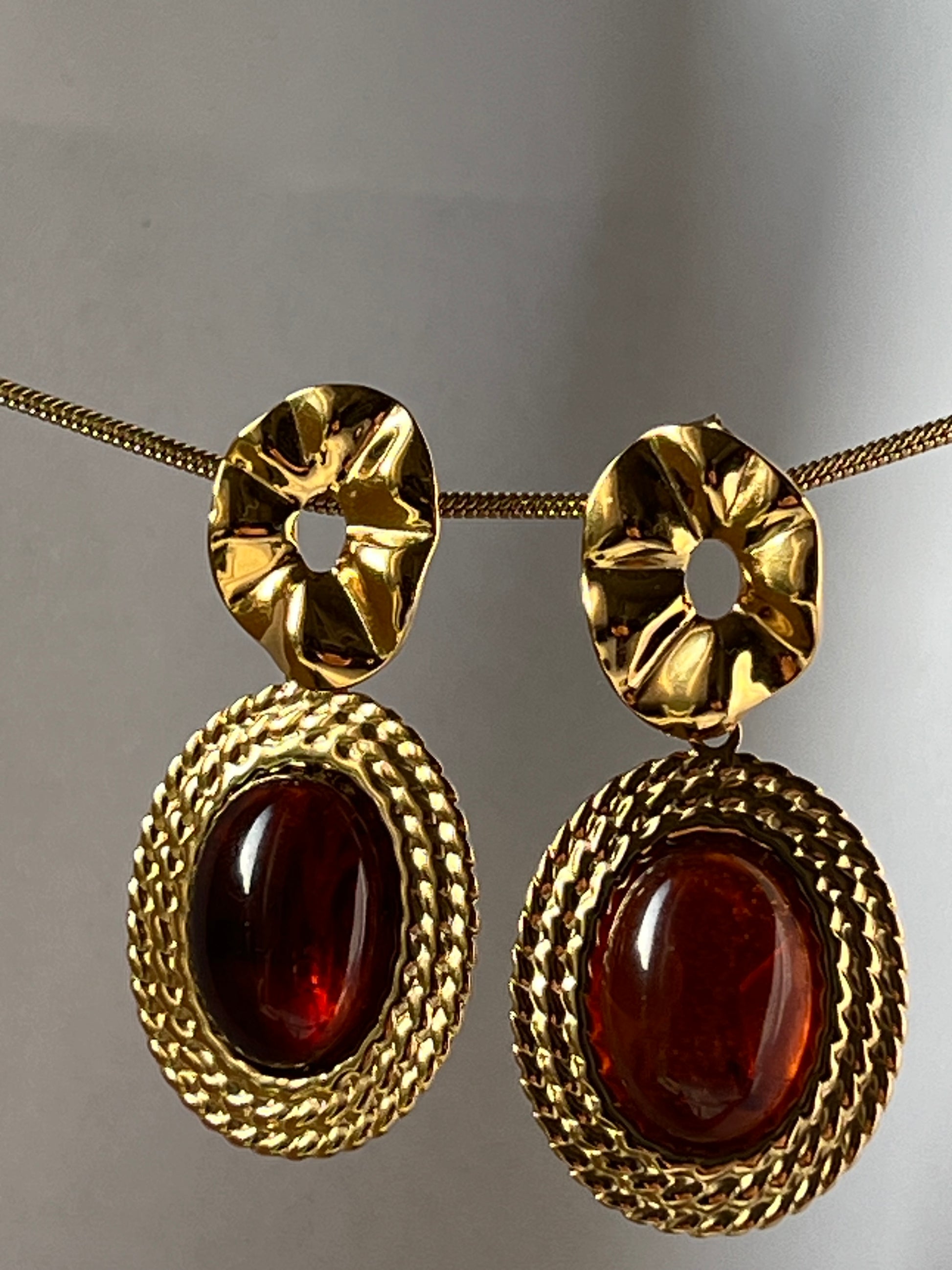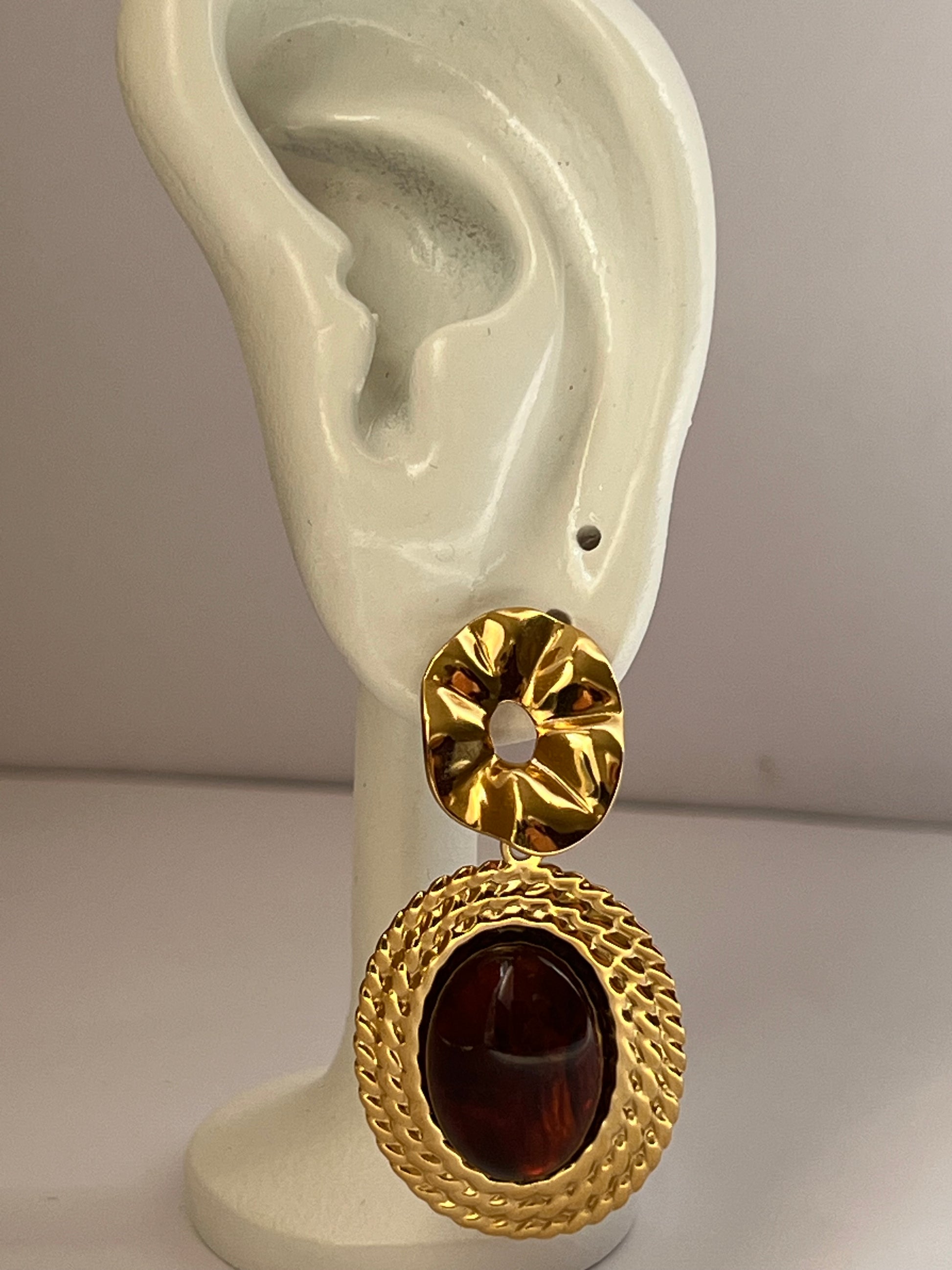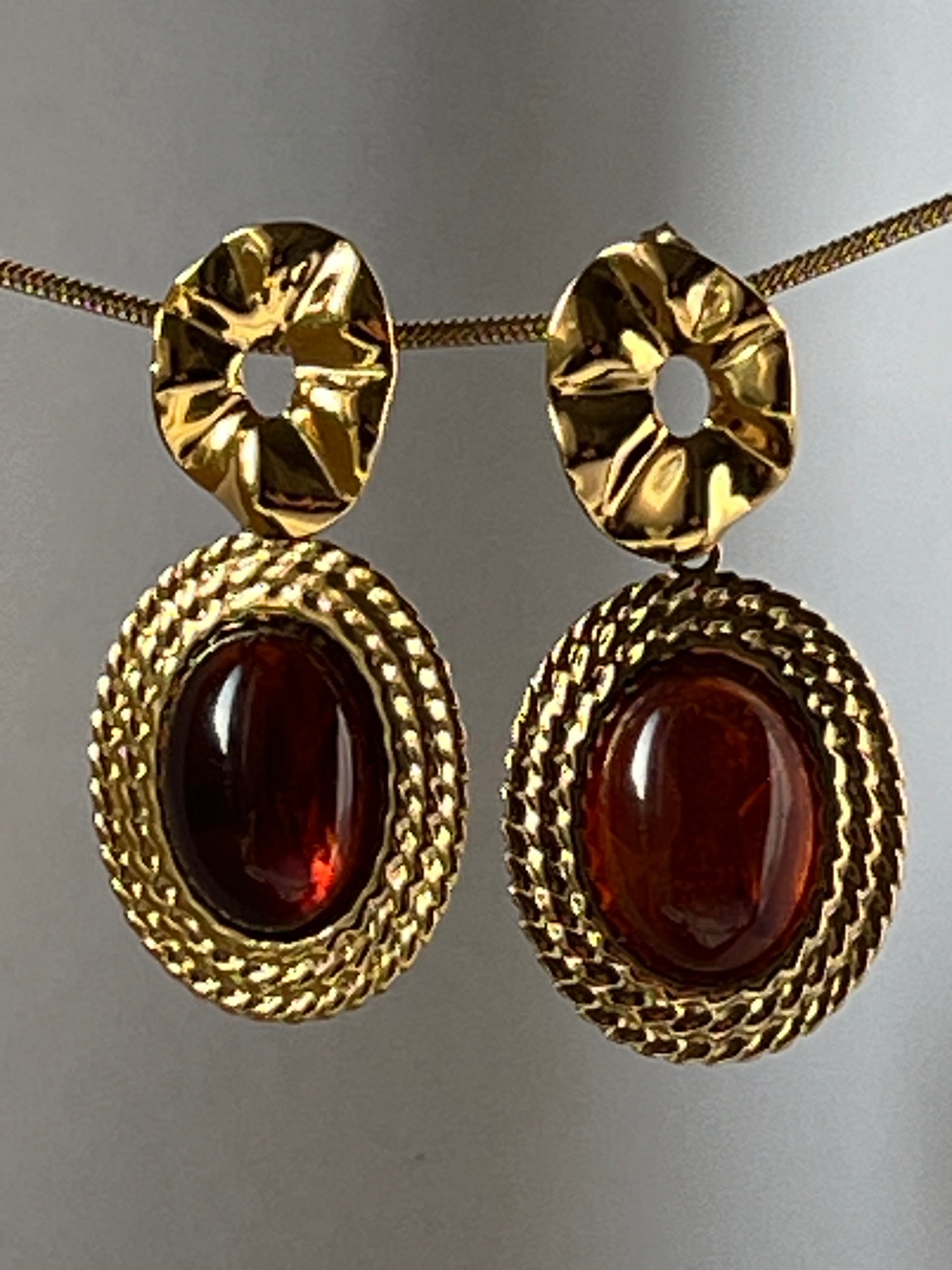 Boucles d’oreilles en acier inoxydable de couleur or, chic et vintage, avec imitation ambre en leur centre.