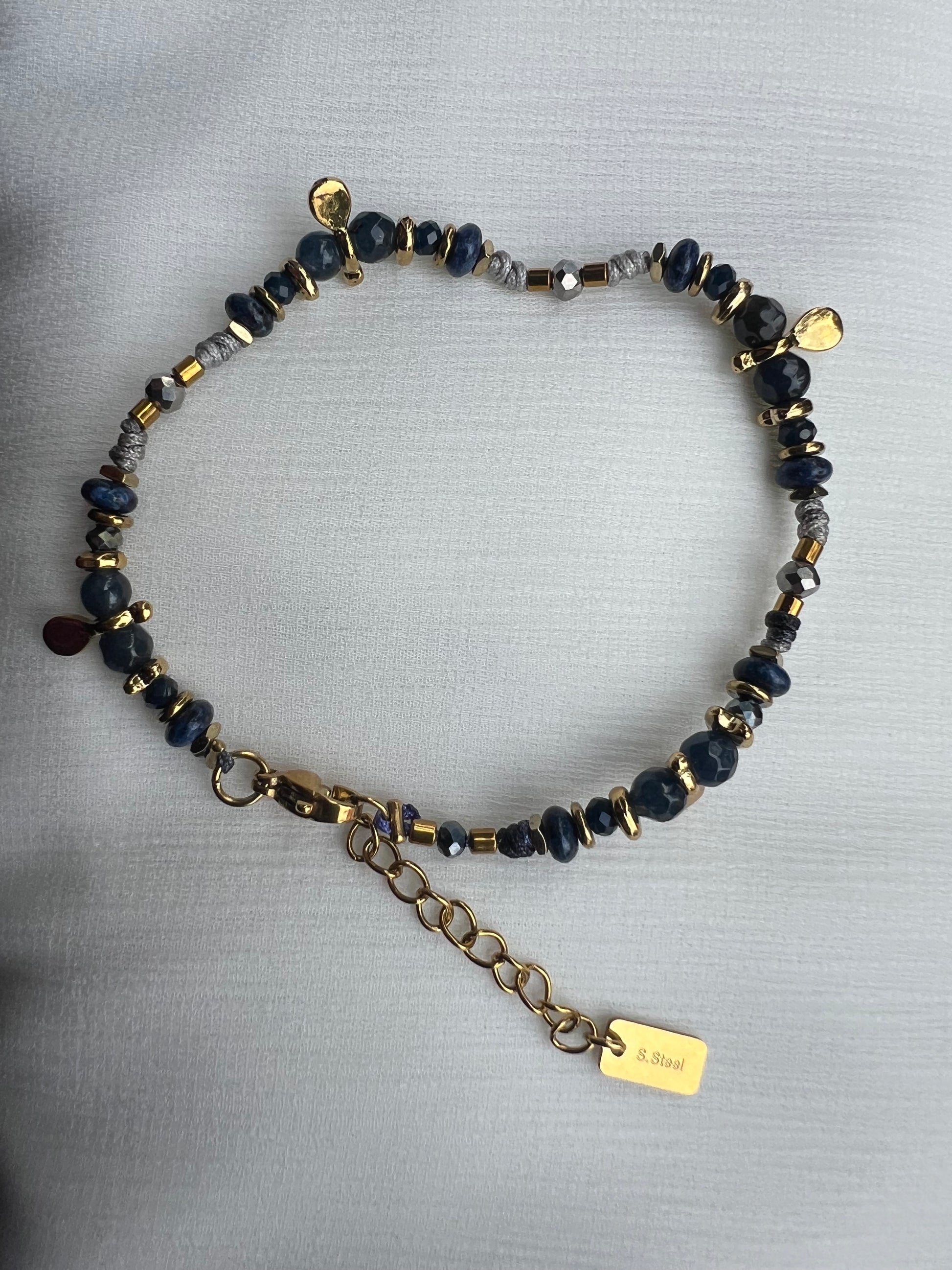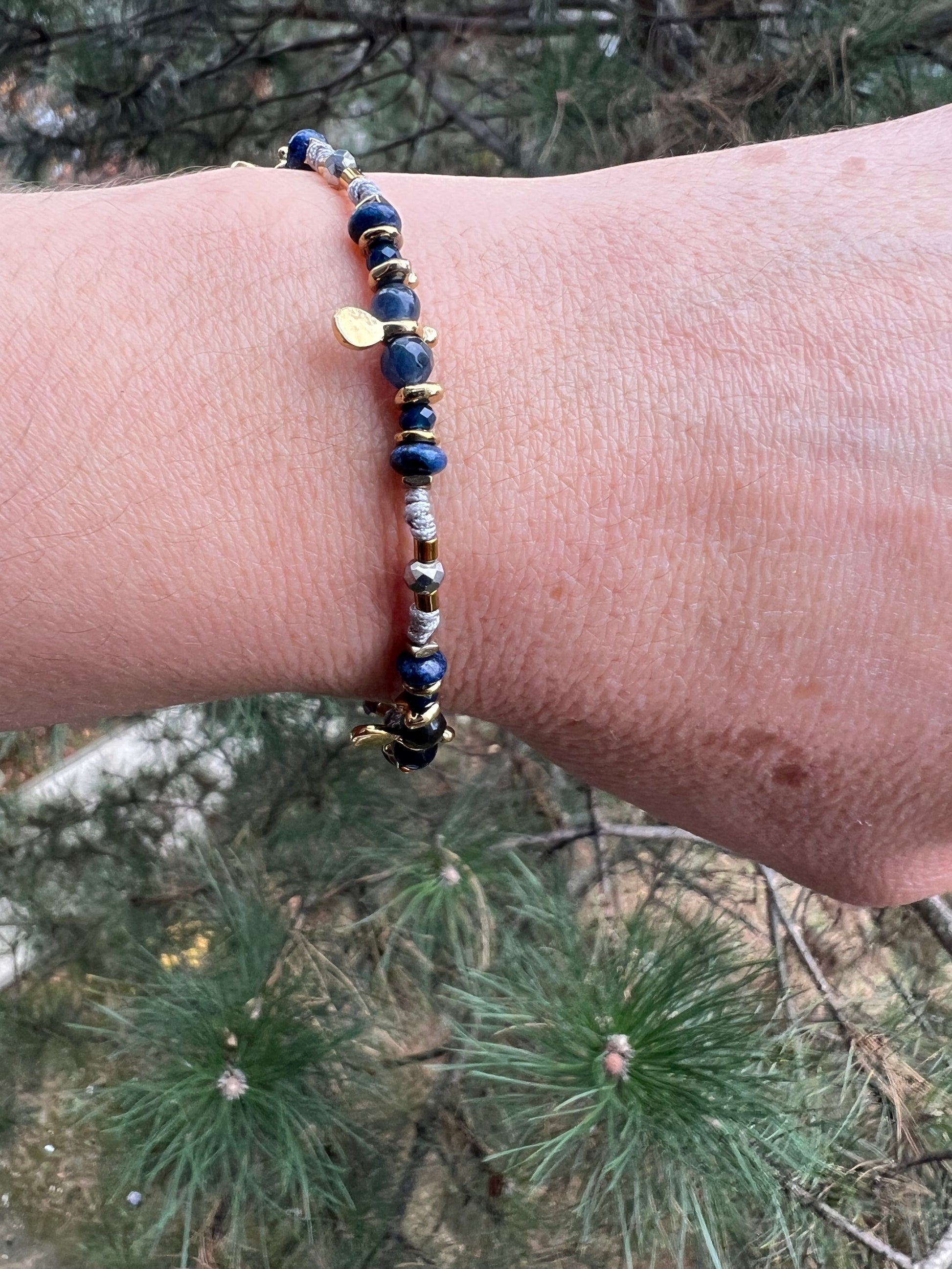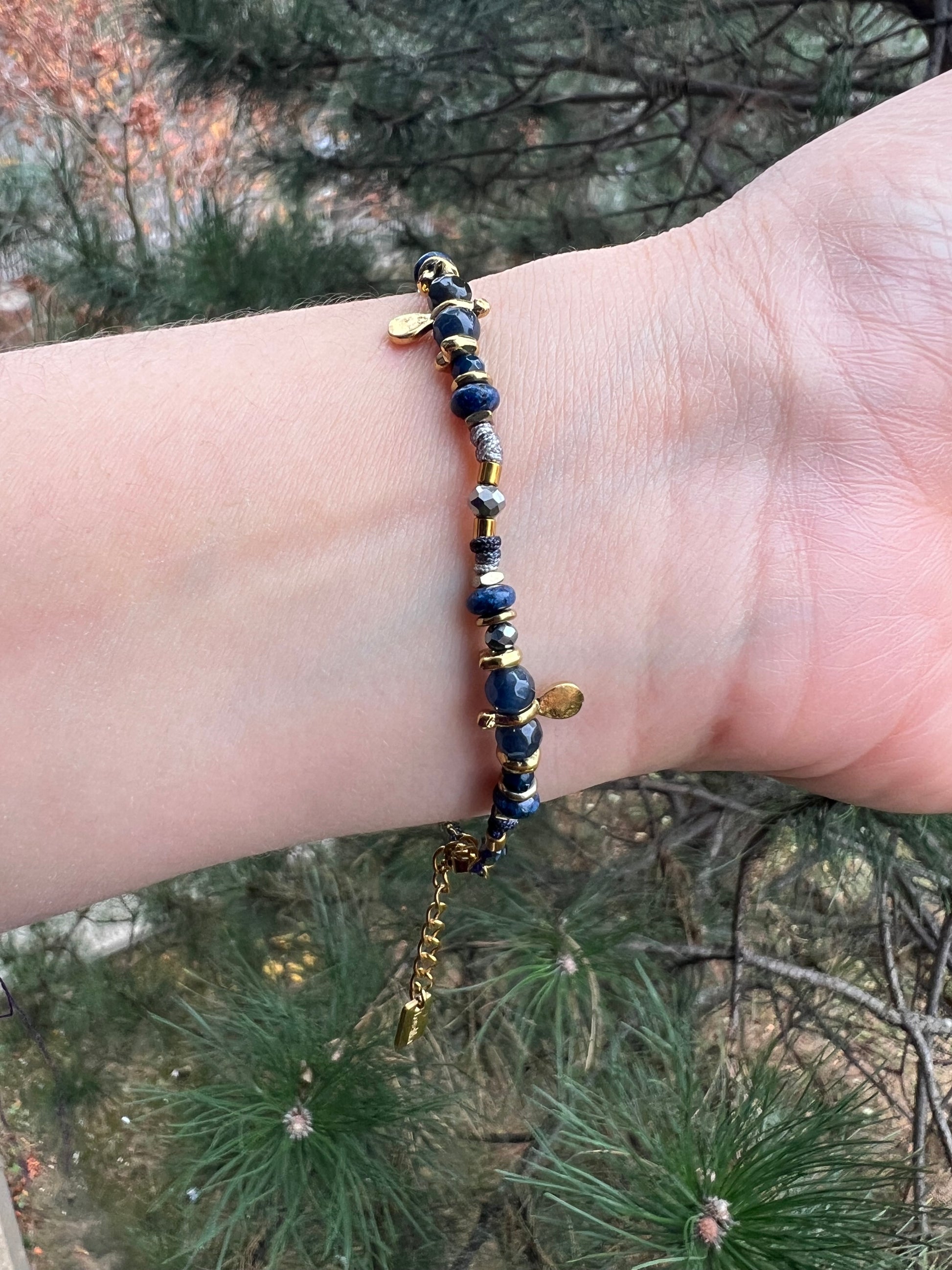 Bracelet composé de petites perles naturelle alternées avec des perle en acier inoxydable.