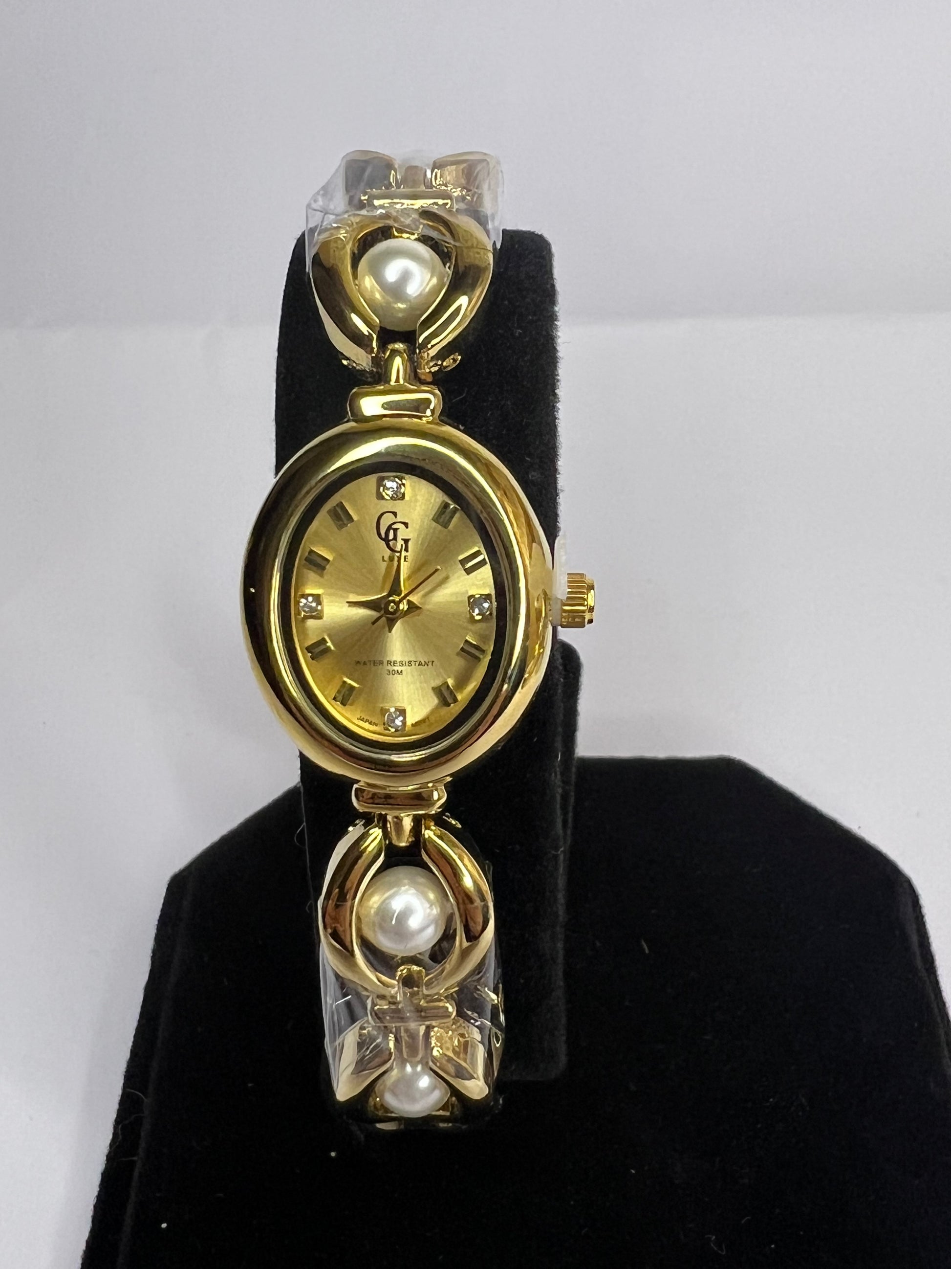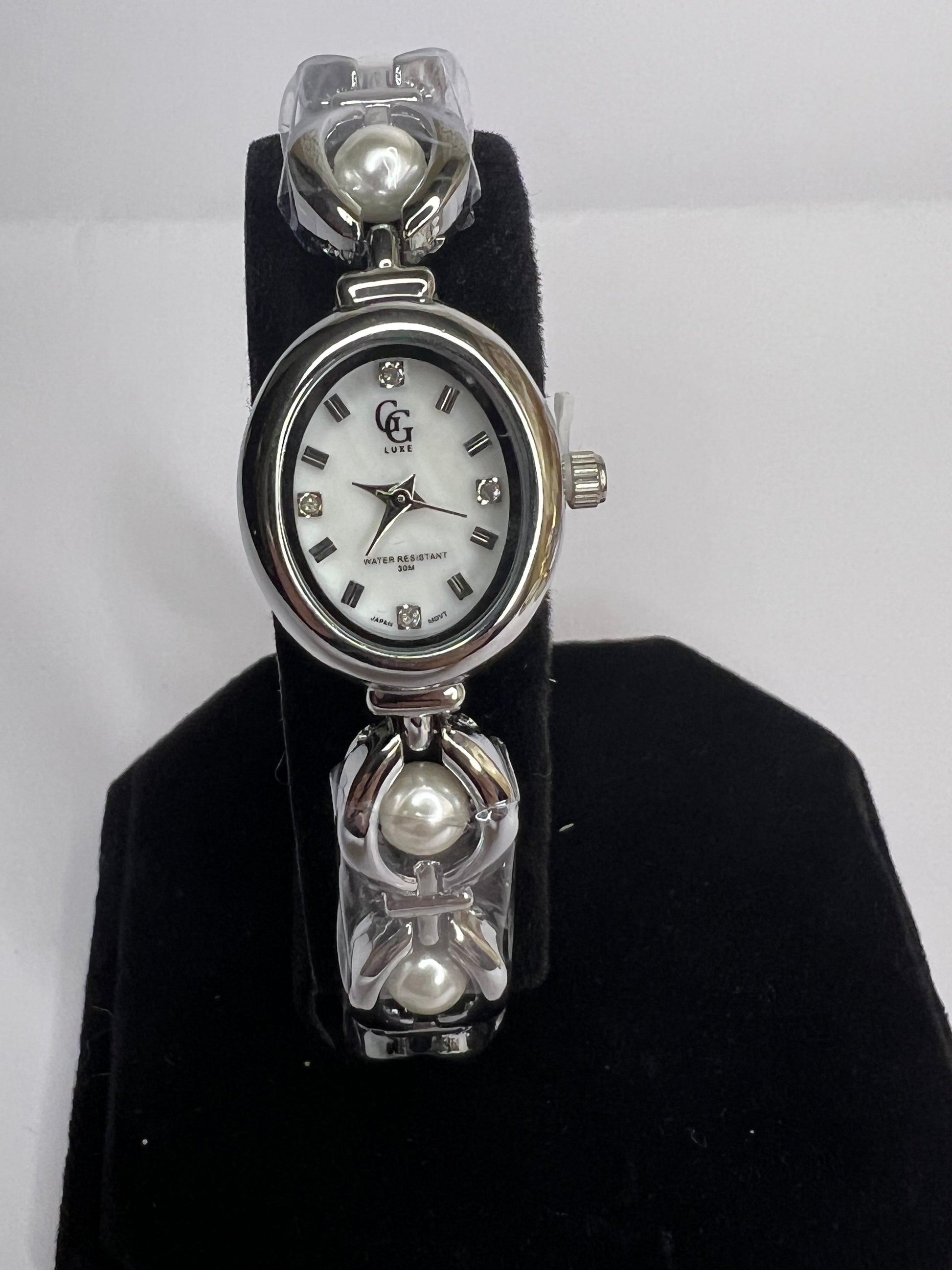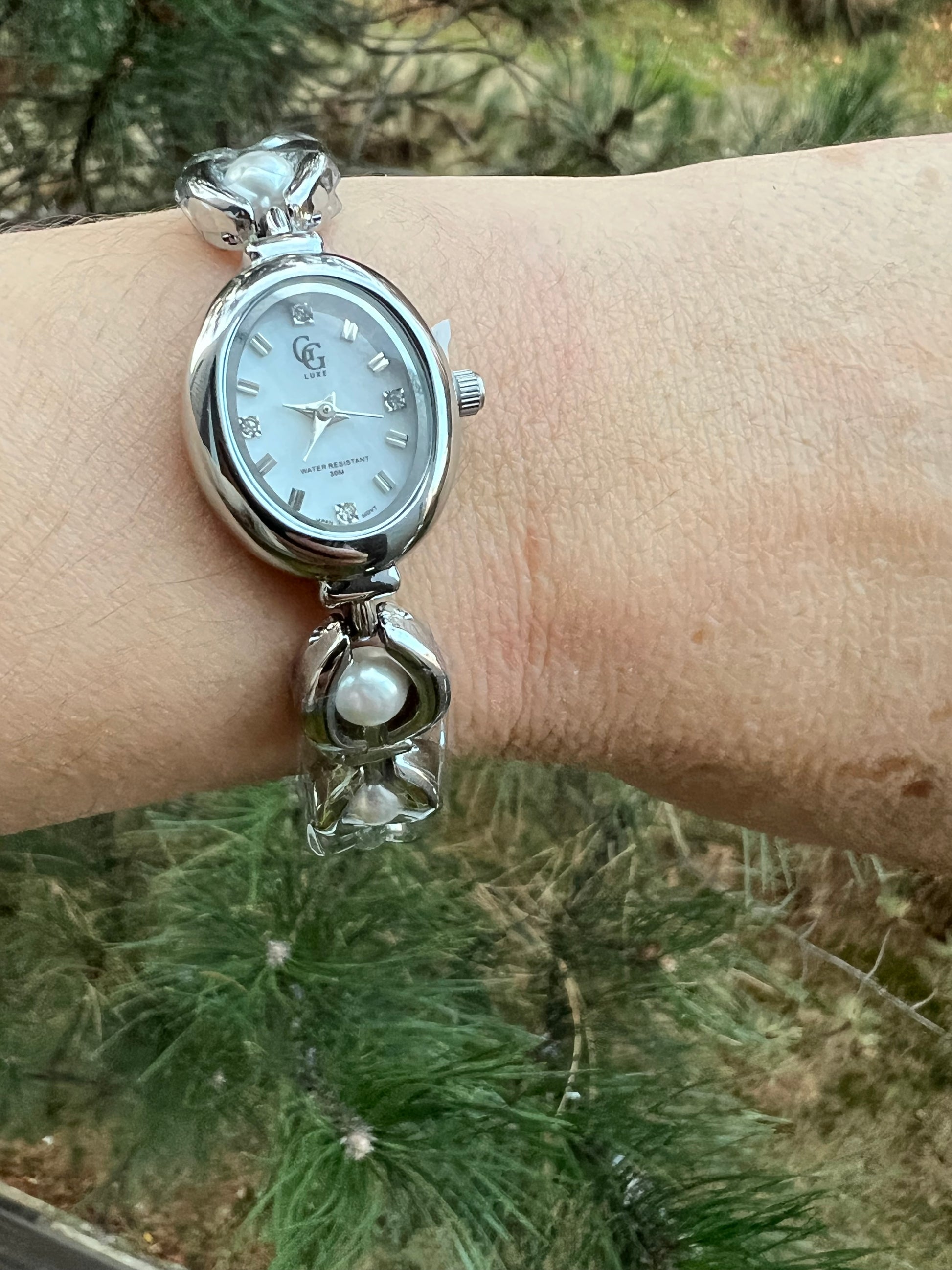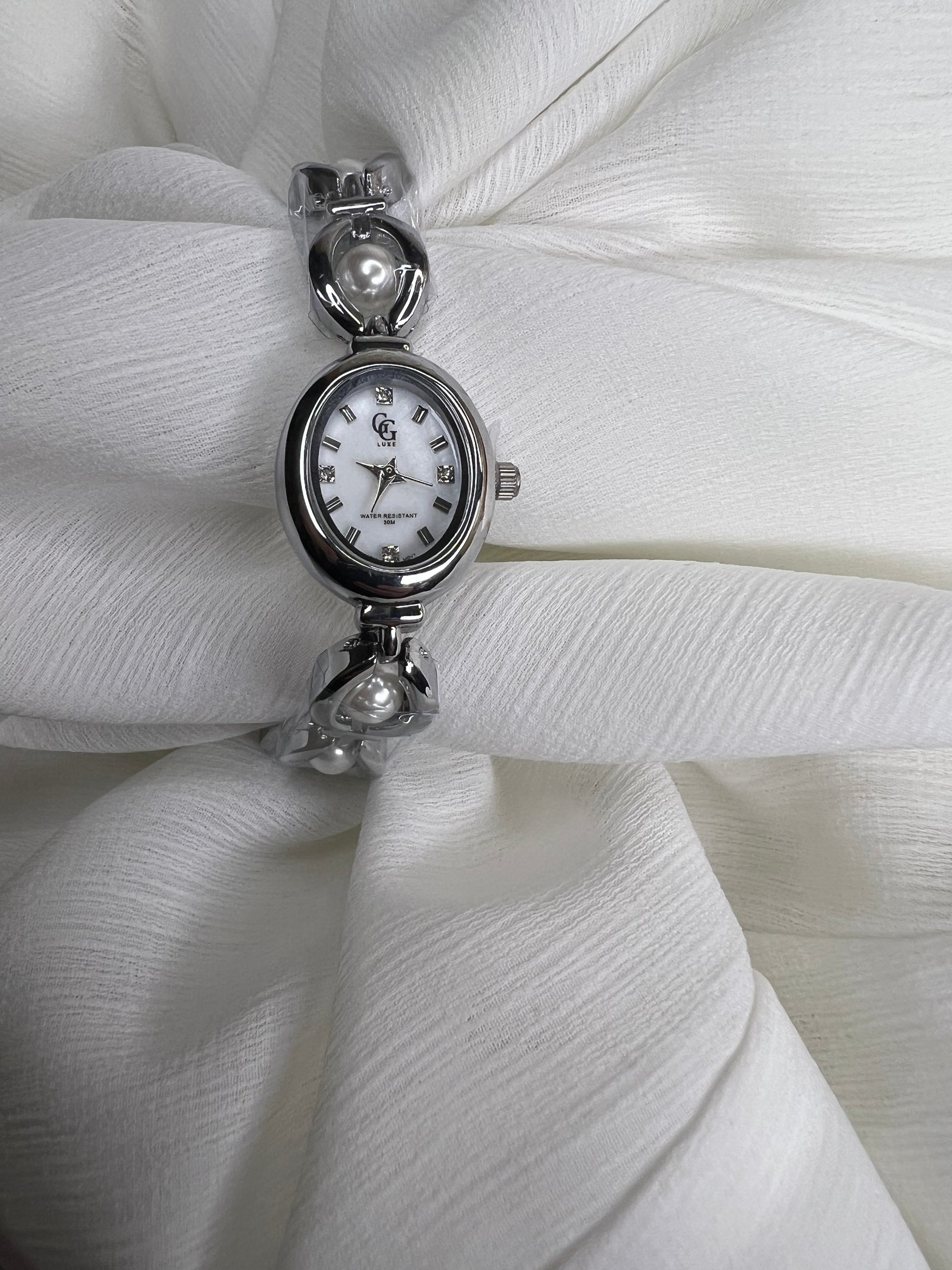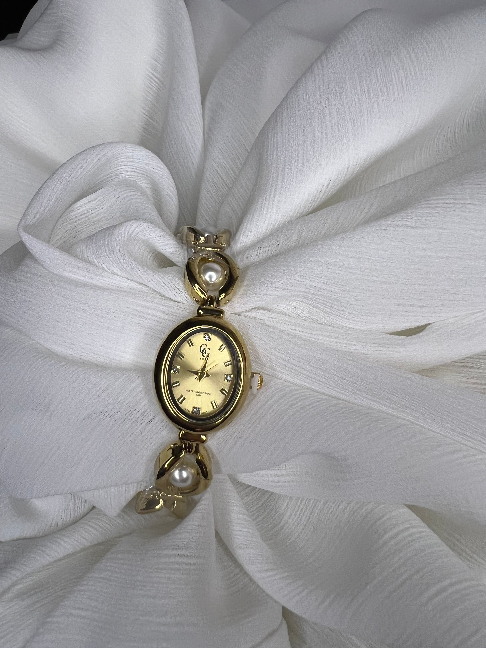 Montre layale élégante avec un boîtier ovale , des repères en petits cristaux. Le bracelet est décoré de perles encadrées de métal, ce qui lui donne un style à la fois raffiné et féminin.
